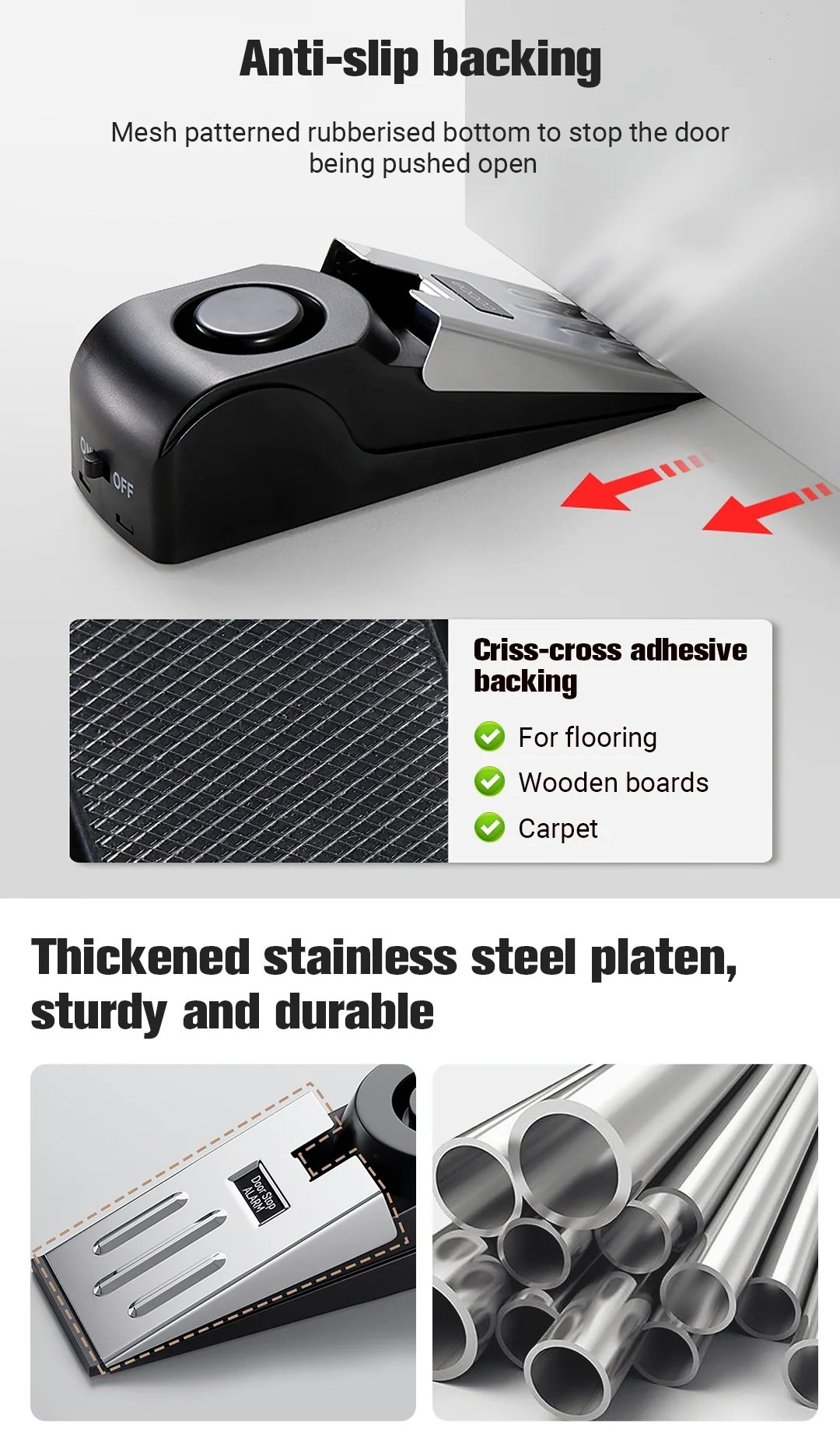 ✅Anti-slip - Some door stops slide away when the door opens and have no effect. But this door stop is different from your usual stop; its anti-slip design ensures it stays where you put it, guaranteeing it goes off when the door is opened in your absence.