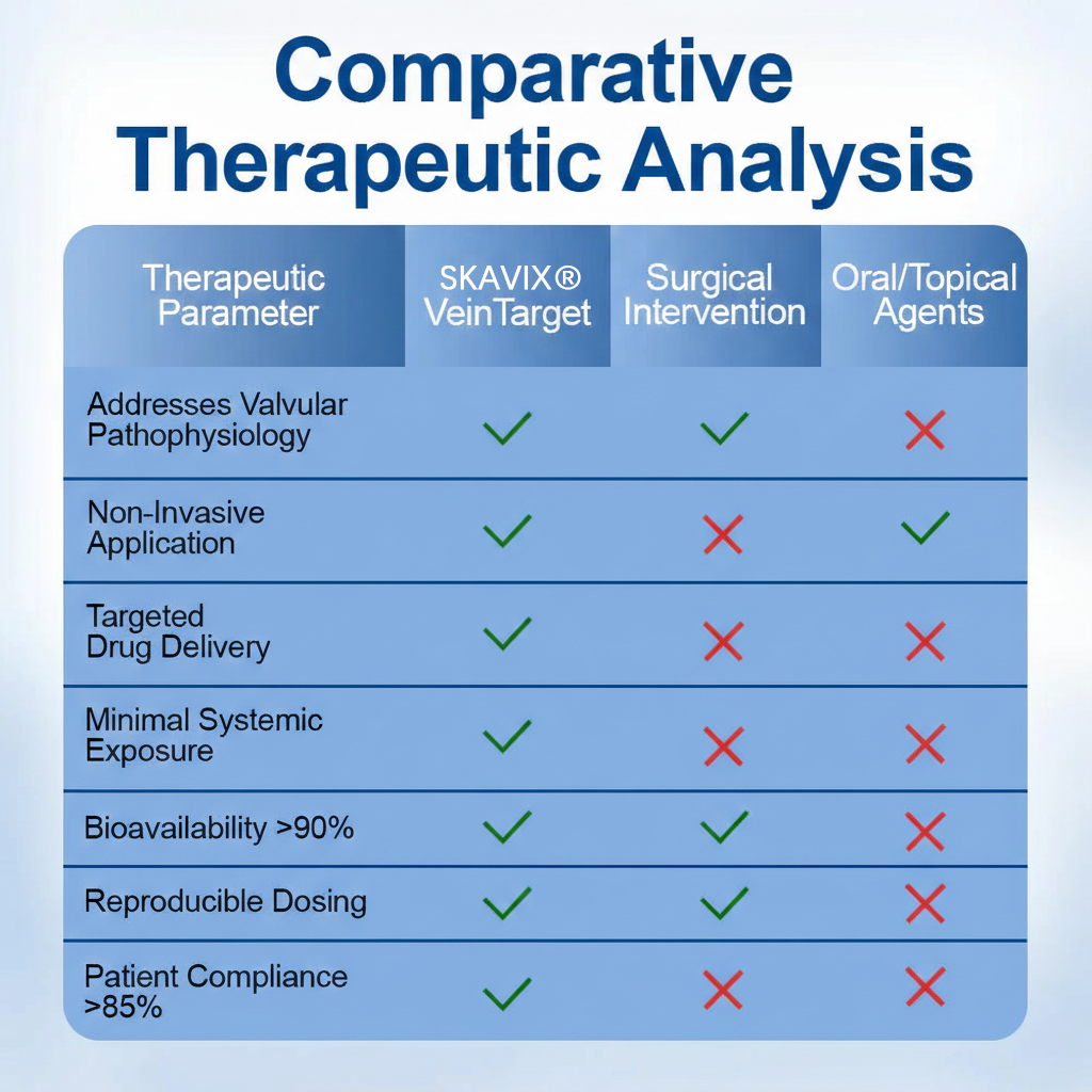 Skavix® VeinTarget represents the first commercially available transdermal phytotherapy system specifically designed to address venous valvular insufficiency through localized botanical intervention. Unlike systemic treatments that dilute active compounds throughout the circulatory system or topical applications that cannot penetrate the dermal barrier, our microneedle delivery system ensures concentrated therapeutic compounds reach the target tissue with minimal systemic exposure.