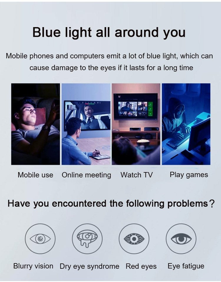 Blue light is all around you. Mobile phones and computers emit a lot of blue light, which can cause damage to the eyes if it lasts for a long time